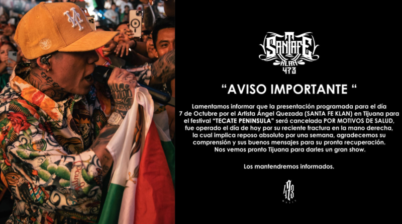 TIJUANA.- Santa Fe Klan, rapero “tumbado” mexicano, cancela show en el Festival Tecate Península previsto para el sábado 7 de