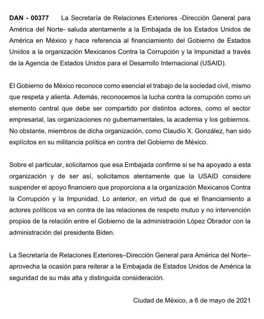 “The foregoing by virtue of the fact that the financing of political actors goes against the relations of mutual respect and non-intervention typical of the relationship between the Government of the López Obrador administration and the administration of President Biden.”