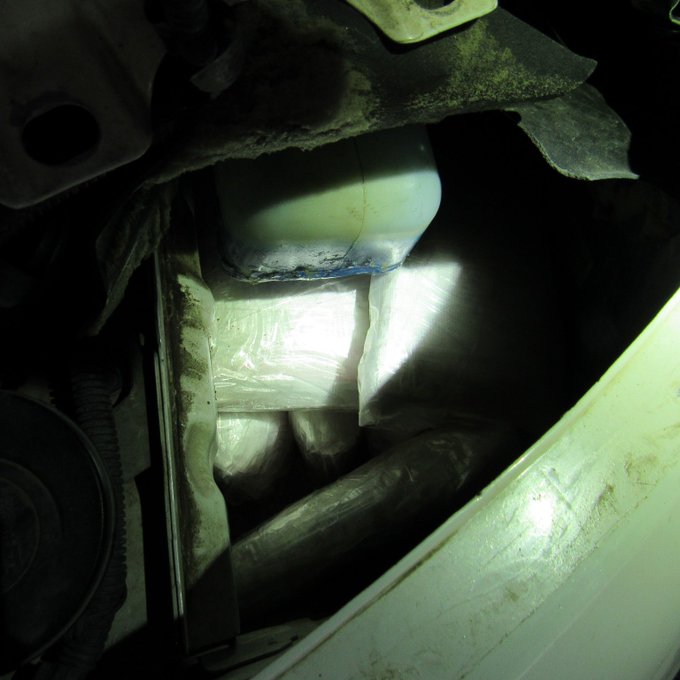 Following a positive alert by a CBP narcotics detection canine to a scent it is trained to detect, the subsequent search of the vehicle led officers to 20 packages of drugs hidden in the front bumper.