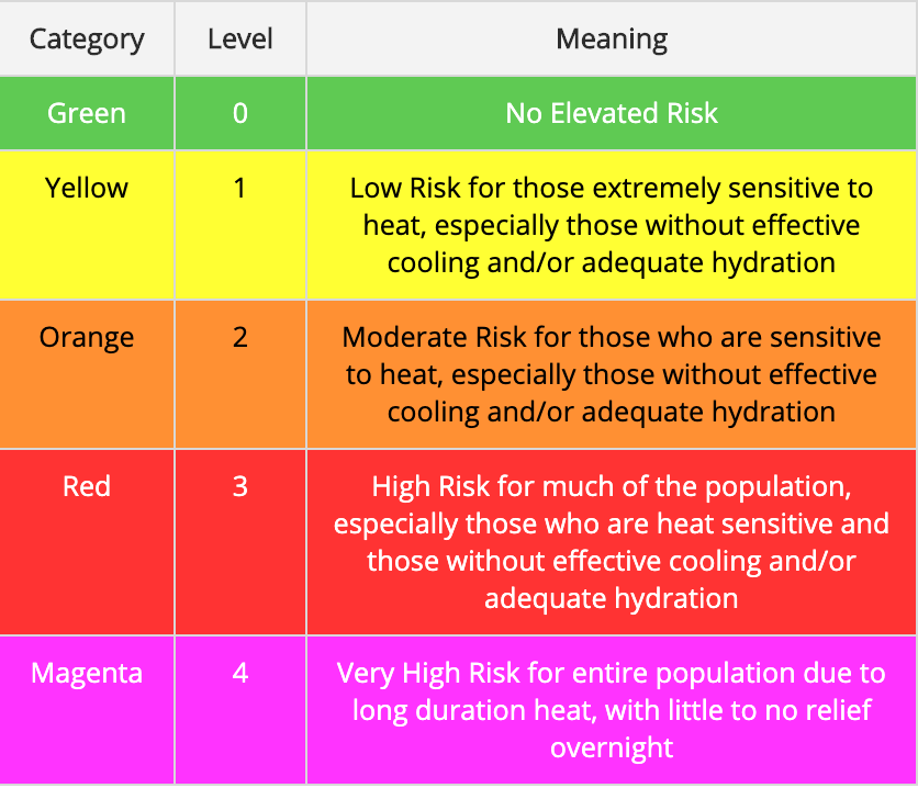 An orange alert is the third of five levels and indicates a moderate risk for those who are sensitive to heat, especially when lacking adequate hydration or cooling devices.