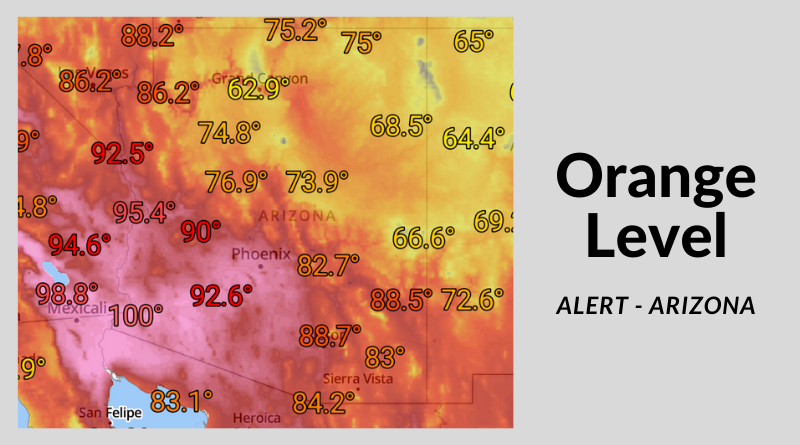 TUCSON, ARIZONA, US – An Orange Level Alert was raised for some areas of the Sonoran desert due to a heatwave that will strike over the weekend, mainly in the western corridor between towns such as Sonoita and San Luis.