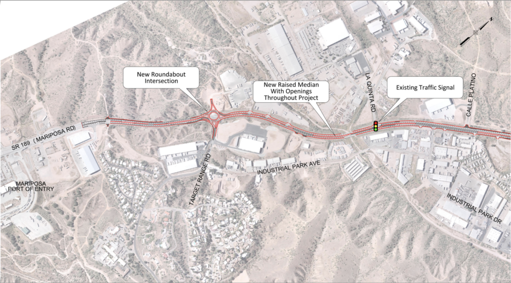 There will be construction of new flyover ramps connecting Mariposa Road with Interstate 19, and construction of a new roundabout at the intersection of Mariposa Road with Target Range Road.