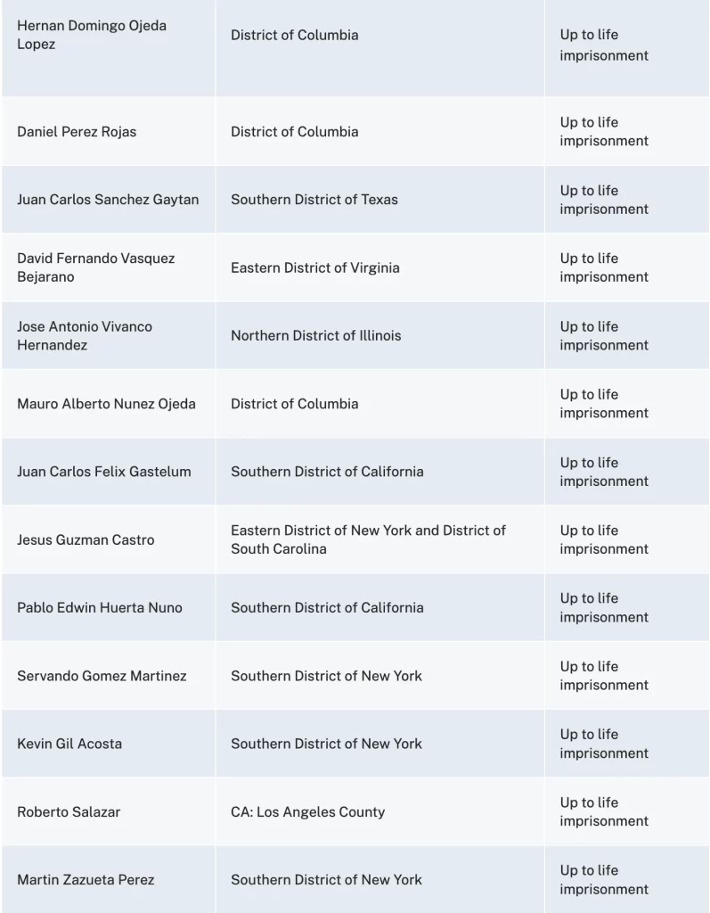 El Departamento de Justicia reveló las identidades de los capos entregados, acusados de narcotráfico y otros crímenes graves.