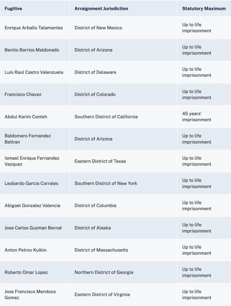 El Departamento de Justicia detalló que estos 26 fugitivos enfrentan cargos federales y estatales.