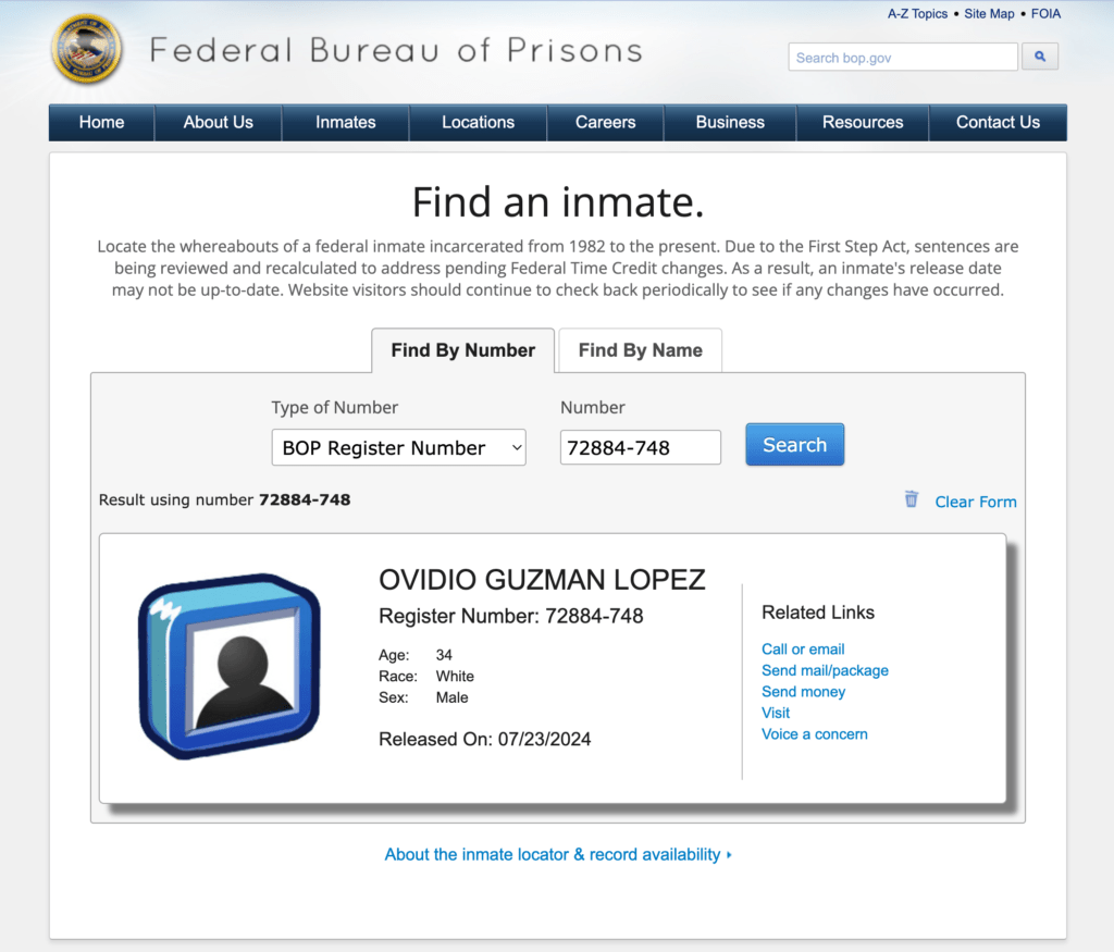 Ovidio Guzmán López Libre, se preguntaban usuarios de redes sociales tras una búsqueda en el Buró de Prisiones en Estados Unidos