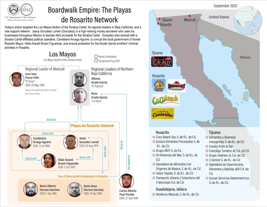 Tesoro de EU anuncia sanciones a La Mayiza del Cártel de Sinaloa en Playas de Rosarito, Mexicali y Tijuana, Baja California