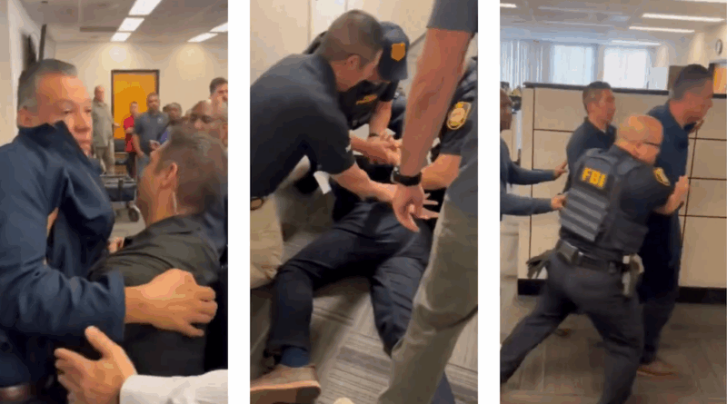 LOS ANGELES.-El senador Alex Padilla es expulsado a la fuerza, de una conferencia que presidía en el FBI la secretaria